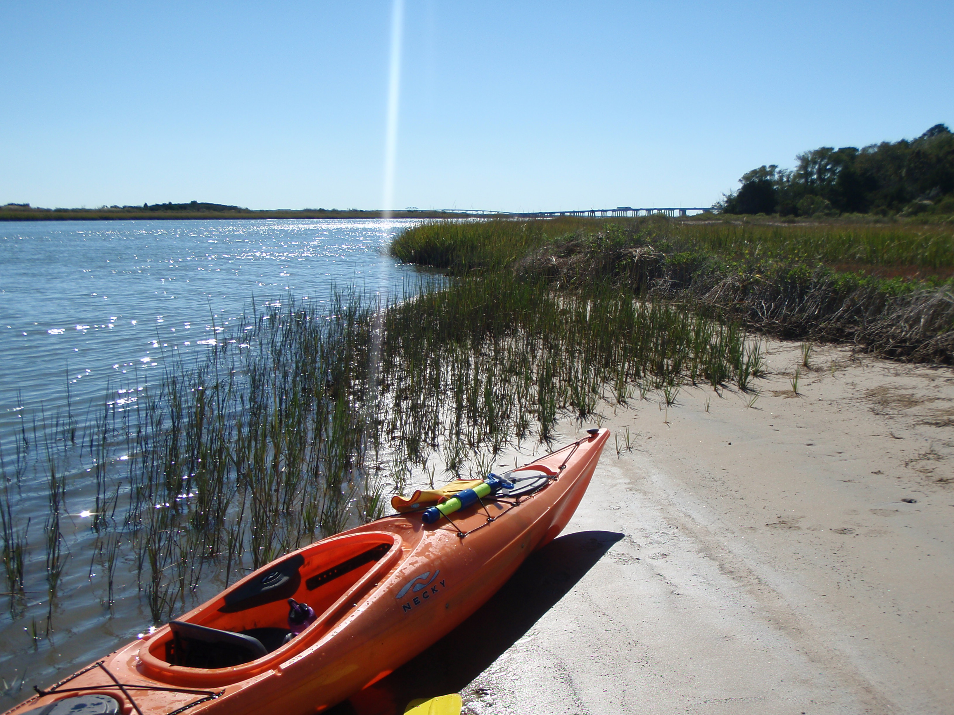 The plan was to launch at the free kayak launch at the Refuge, but since the tide was too low and there wasn’t enough water in the creek, we launched at the boat ramp. The guy working at the boat ramp was a brat and wanted to charge us the $10 launch fee. Seriously, dude? You’re going to charge us to launch kayaks here when your stupid free kayak launch area is inaccessible? Neither of us had any money (or a freaking checkbook! yes, he said they accepted checks) we said we’d go to an ATM when we got back. Maybe he’d be gone when we got back – we WERE planning to be gone almost all day.