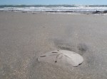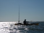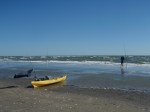 We then high tailed it through the marsh and back to our kayaks (mosquitoes were wicked in the grasses). We headed down around the south end of the island and to the ocean side. Brian carefully chose his fishing spot for the day and I spent most of the time beachcombing. For an island that is so remote, the beachcombing wasn’t spectacular. On the other hand, the fishing was decent as Brian caught a small red drum (although it was still too big to keep – if they are over 27 inches you have to release)!