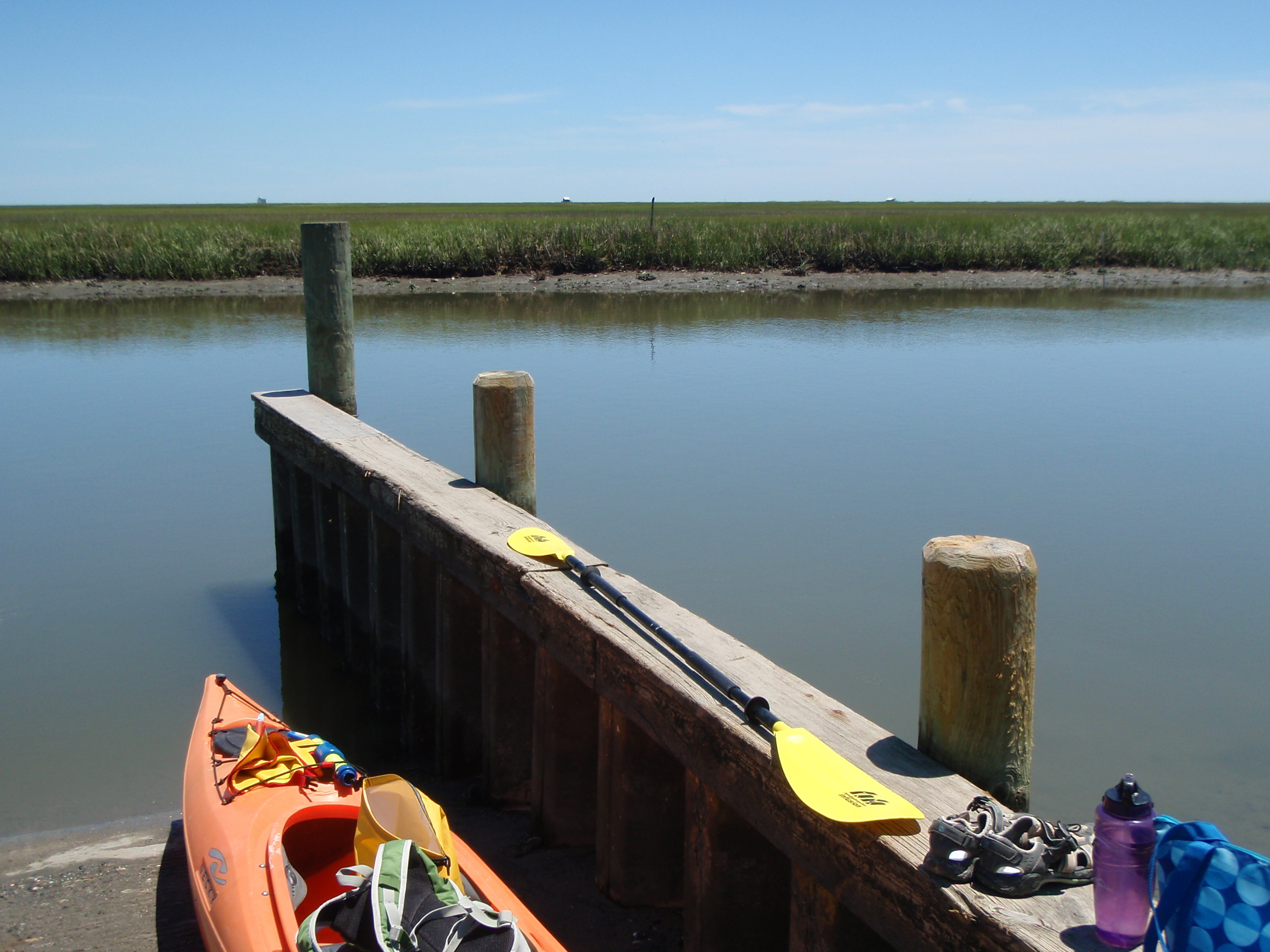 My left shoe got sucked off as I was in mud to just above my knee. Somehow I slid my hand down a good foot into the mud and salvaged my other shoe. Then the mud got deeper. Yup, up my entire thigh. Make that both thighs. In the sheer panic that I was going to drown in mud, my adrenaline must have given me the power to hoist myself into my kayak (not my legs though, I just sort of hung them off the sides so my whole kayak didn’t get covered in mud. Holy crap. What do I do now? I’m stuck on a mud flat in 1 inch of water. I’m not moving. I can’t get out and walk or I’ll be swallowed up my the marsh mud for good. Wait for the tide to come in? Ugh, that’ll take hours. I think at this point I shed a few tears in disbelief of my situation and how I would ever get out of it. That’s when I prayed for a solution. And solution I got! I started to mud paddle and it kind of worked. A few paddles on the left, a few paddles on the right, and I had moved a few feet! Another few feet later I was in maybe 2 inches of water. And then the wind picked up and pushed me even further! Slow and steady, and an hour later, I was back to paddling in 6+ inches of water again. Whew! What an ordeal! I was physically and emotionally exhausted, but overjoyed to be in navigable water again!