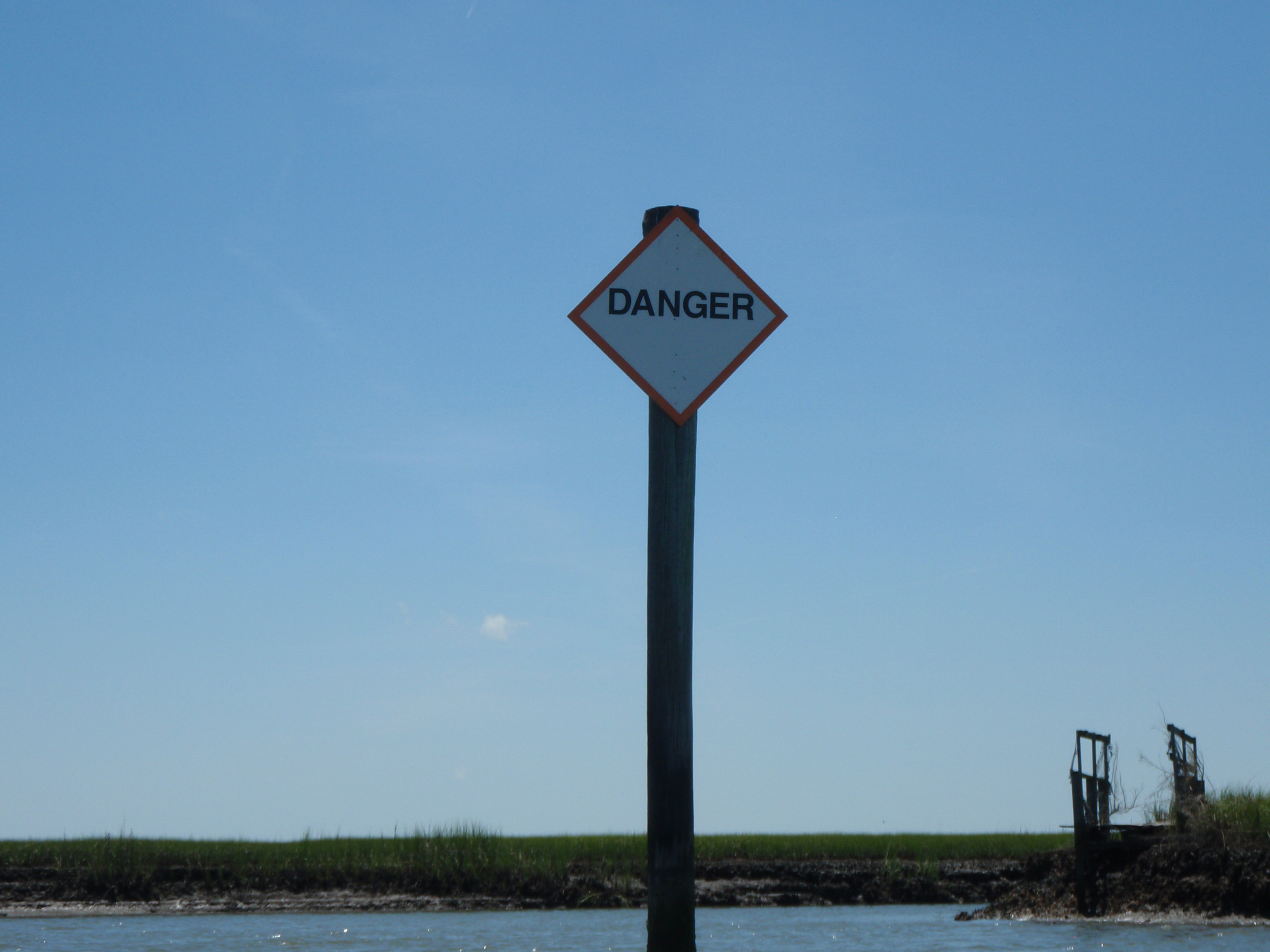 As I came around another bend, I saw a channel marker in the distance. However, as I got closer, I realized it was white with an orange border, which usually means some kind of obstruction or danger ahead. As I got close enough to read it, sure enough, the sign said “DANGER”. And that was it? Well what kind of danger? Submerged electric line? Unexploded ordinances? Alligator pit? Terrorists?